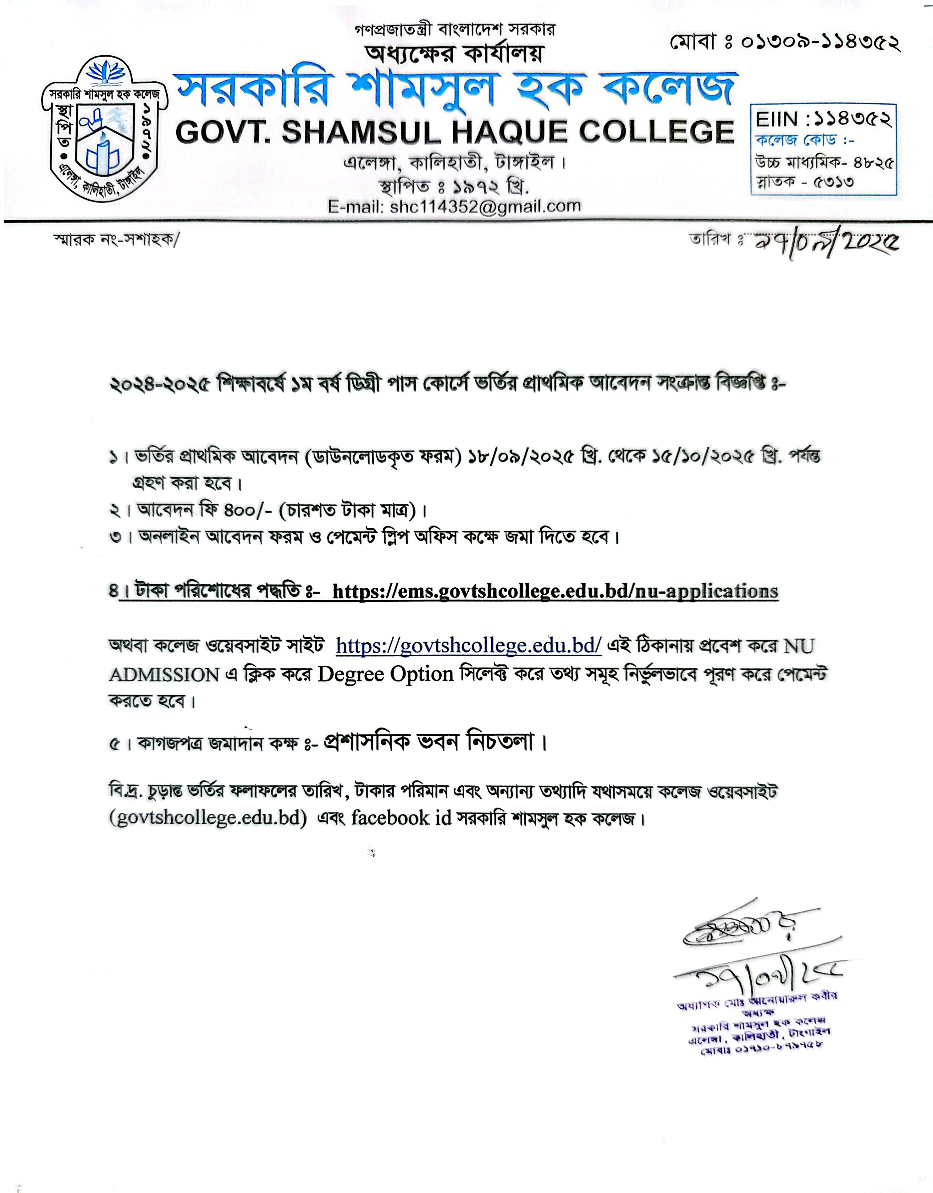 শিক্ষা মানুষকে জ্ঞান, নৈতিকতা ও মানবিক মূল্যবোধে সমৃদ্ধ করে। সরকারি শামসুল হক কলেজ, এলেঙ্গা, কালিহাতী, টাঙ্গাইল – প্রতিষ্ঠালগ্ন থেকে এ অঞ্চলের মানুষের উচ্চশিক্ষার অন্যতম প্রধান কেন্দ্র হিসেবে ভূমিকা পালন করে আসছে। আমাদের এই প্রতিষ্ঠান শুধু পাঠদান নয়, বরং শিক্ষার্থীদের সৃজনশীলতা, নেতৃত্বগুণ এবং সামাজিক দায়িত্ববোধ গড়ে তুলতেও প্রতিশ্রুতিবদ্ধ।